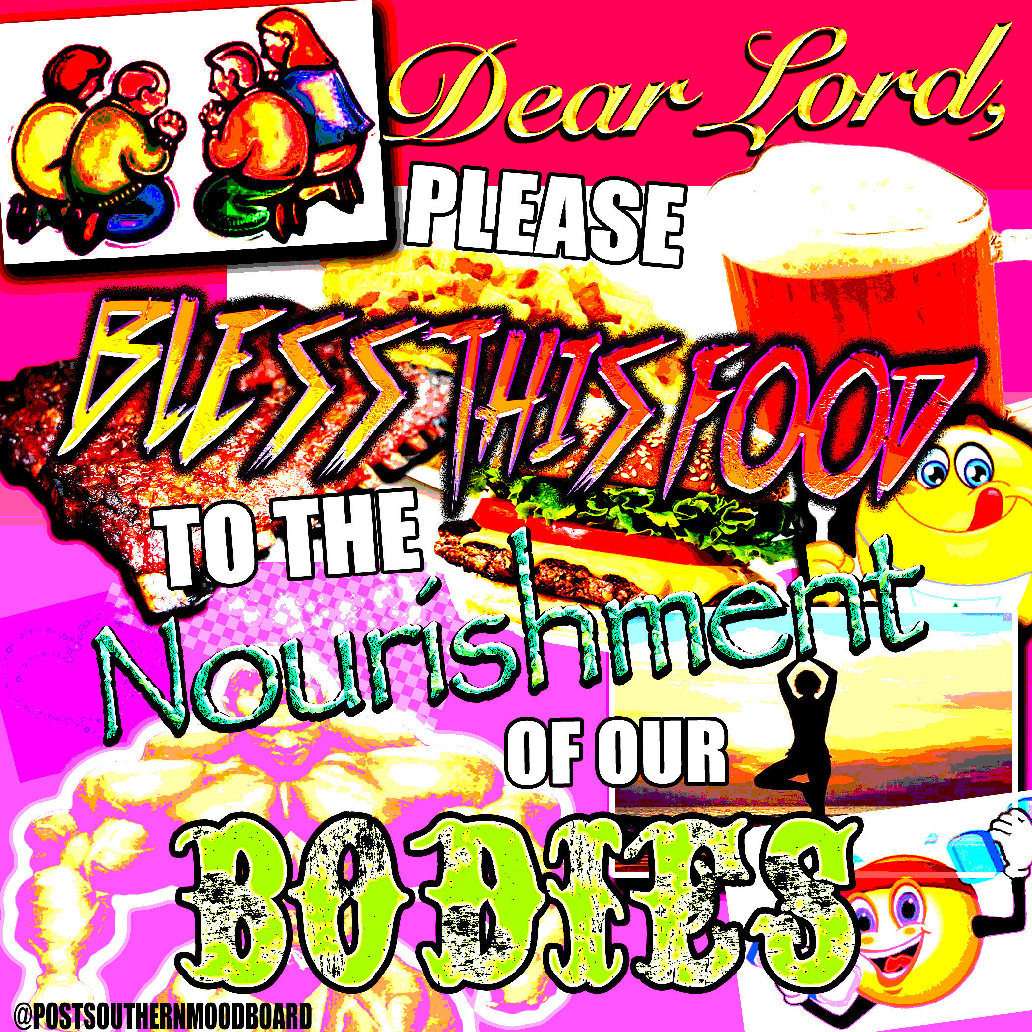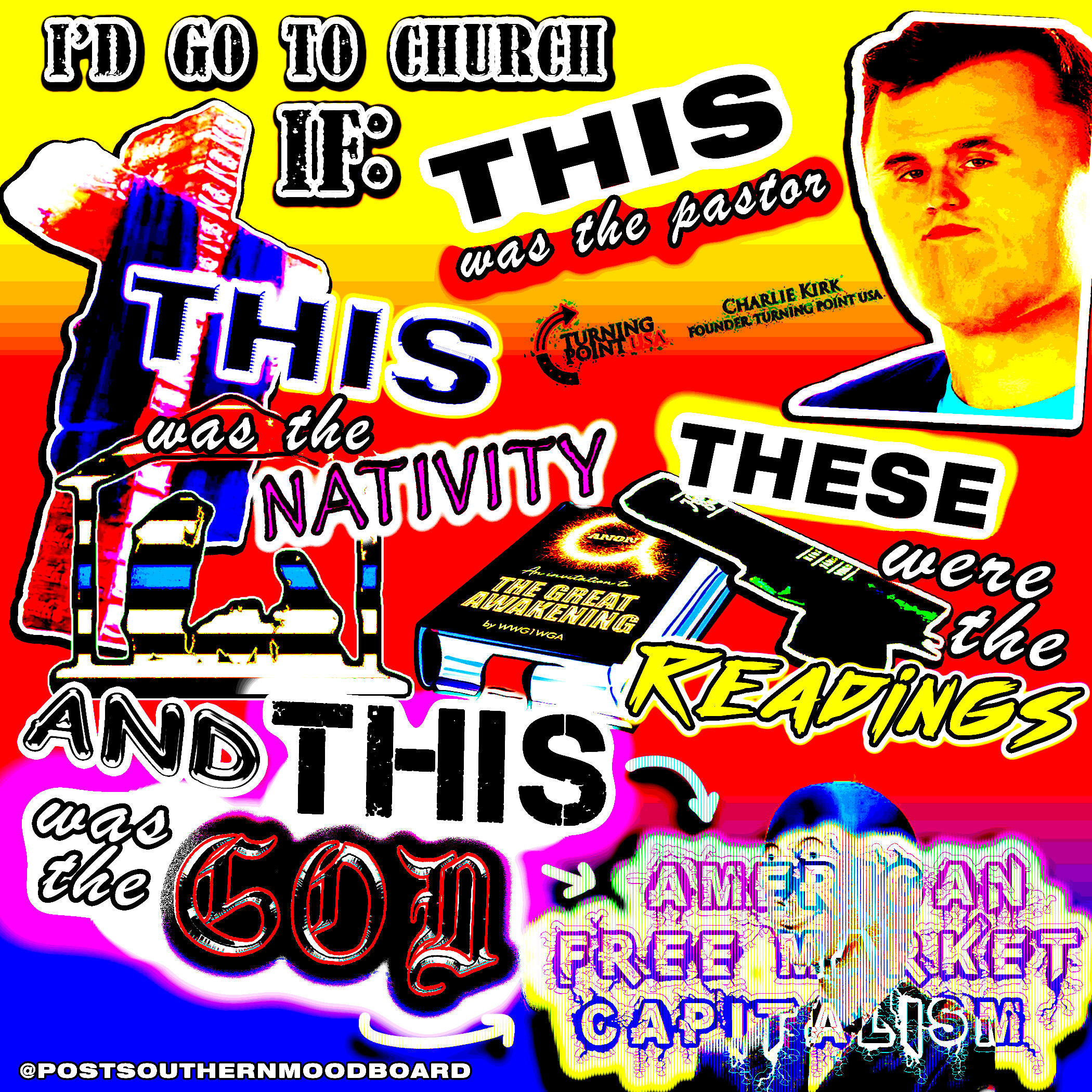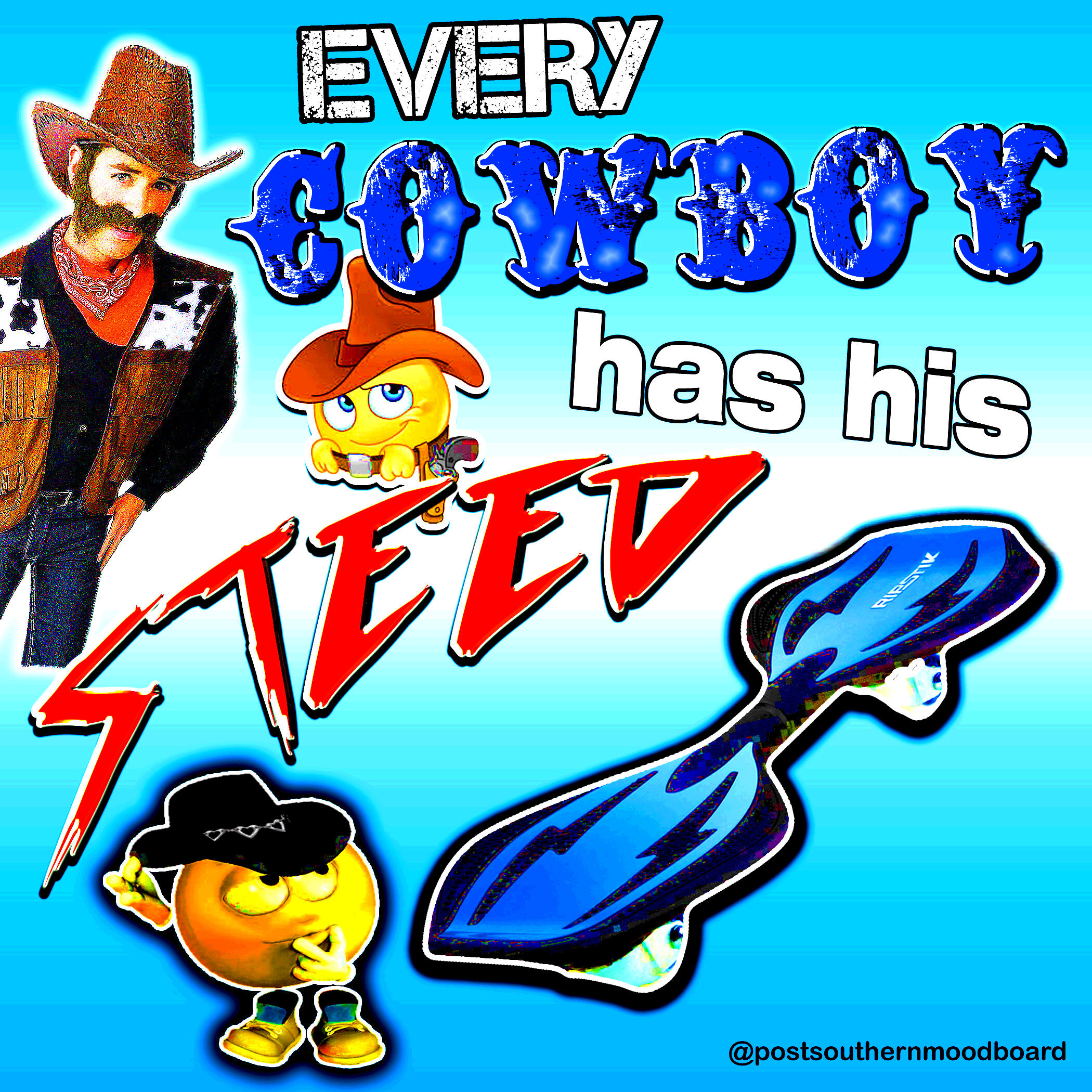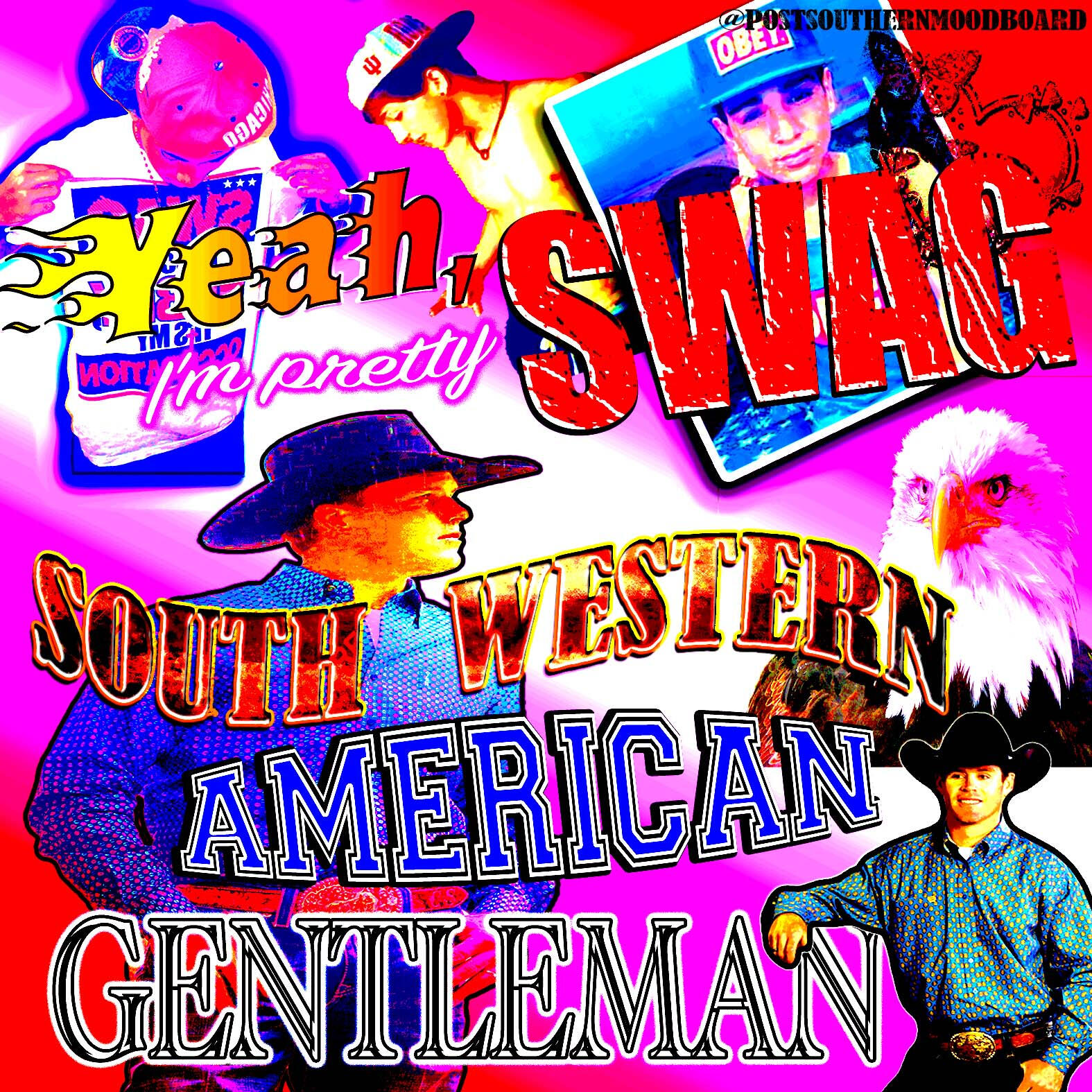 From 2020 to 2023, I ran an Instagram meme page called @postsouthernmoodboard. The page served as a platform for my interests in digital art and graphic design, shitposting, and for a meta-analysis of my own personal relationship to my Southern upbringing as I became an outside observer to my previous culture after moving to New York from 2017-2022. The full project included a gallery of Instagram highlights which showcased various aesthetics which I associated ironically to the Southern and Western culture and memetics which I was satirizing.The complete works of this project are still available on Instagram. Below is a selection of my favorite grid posts.