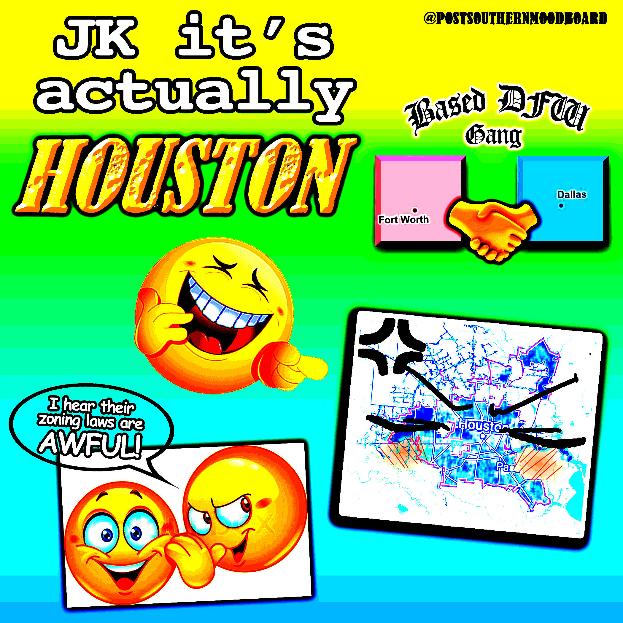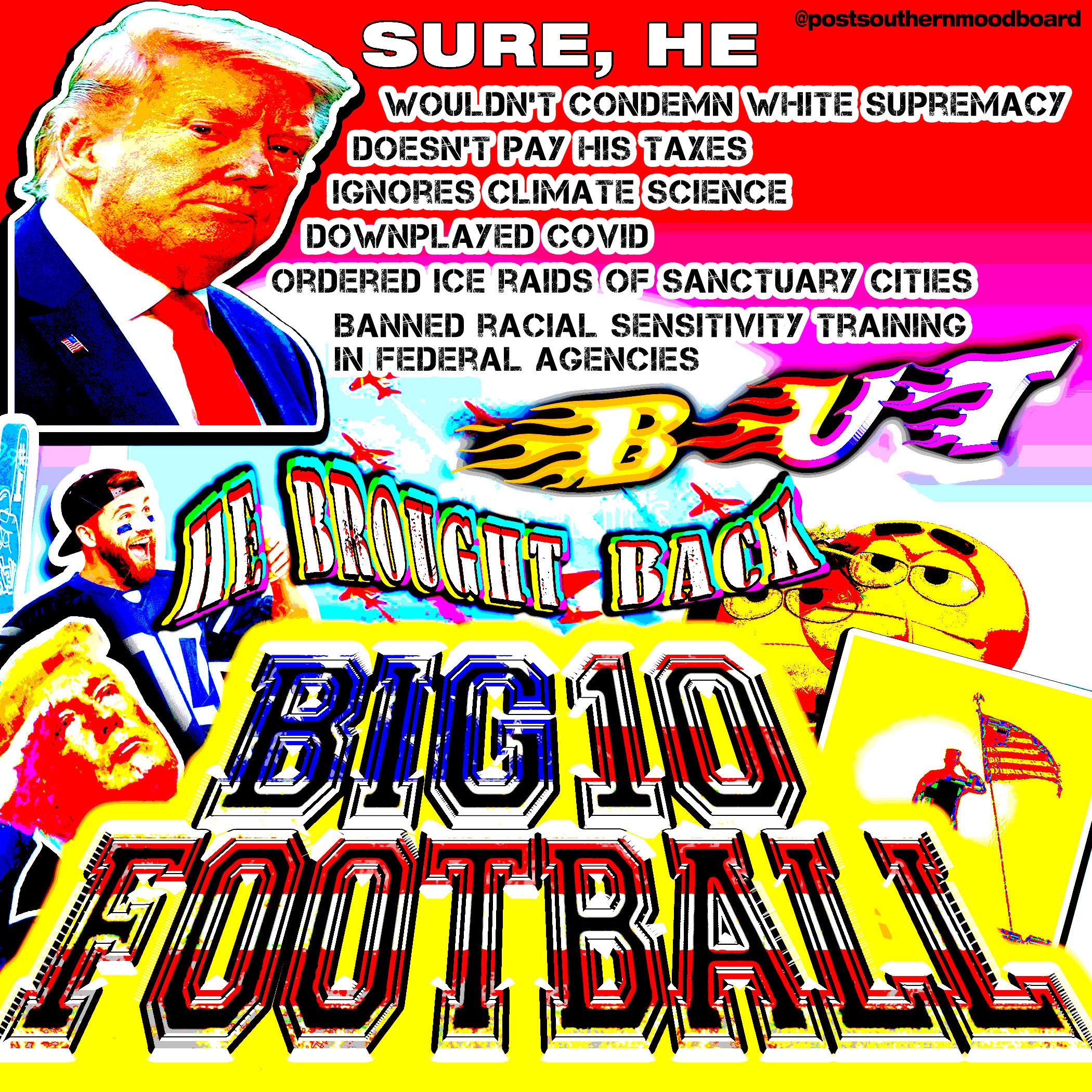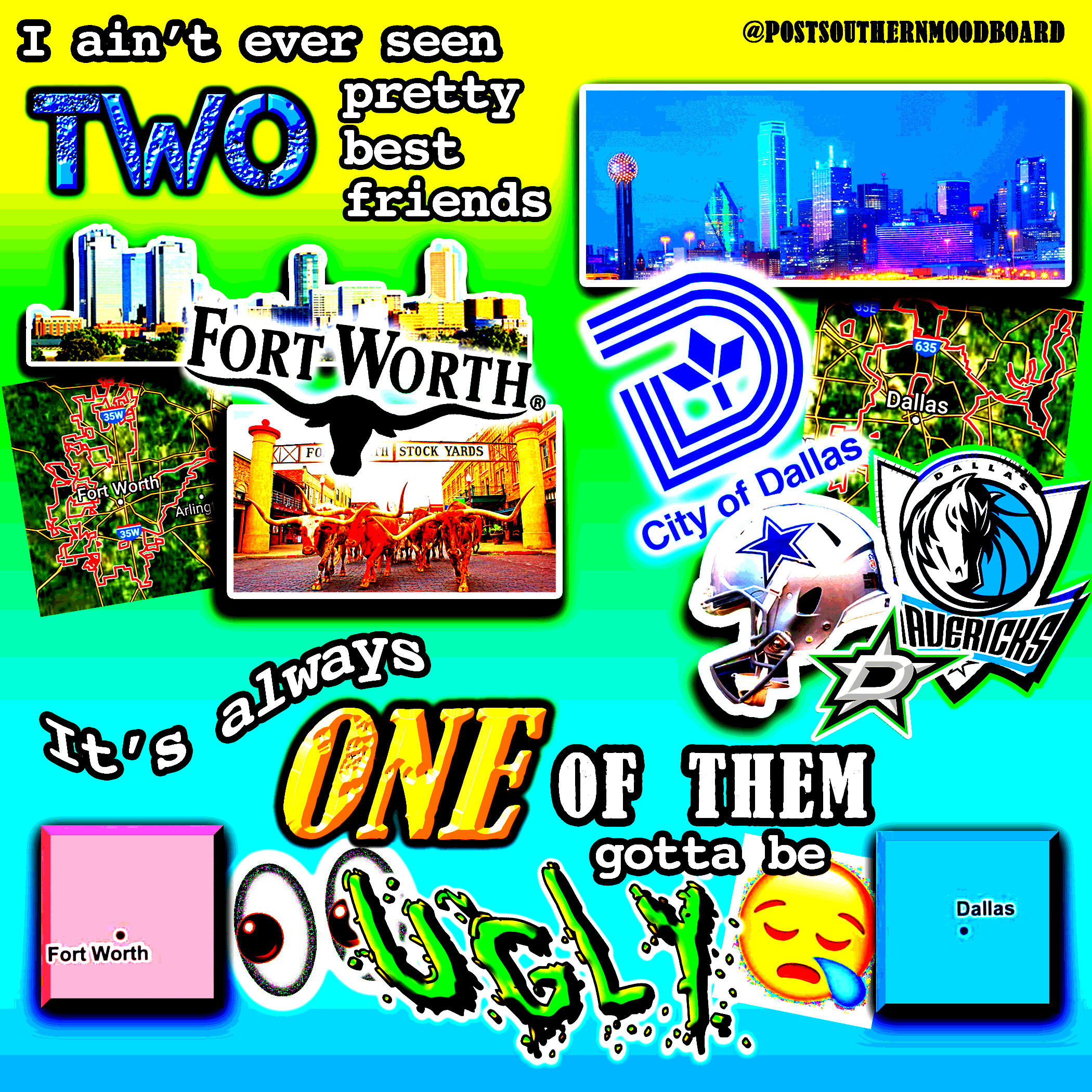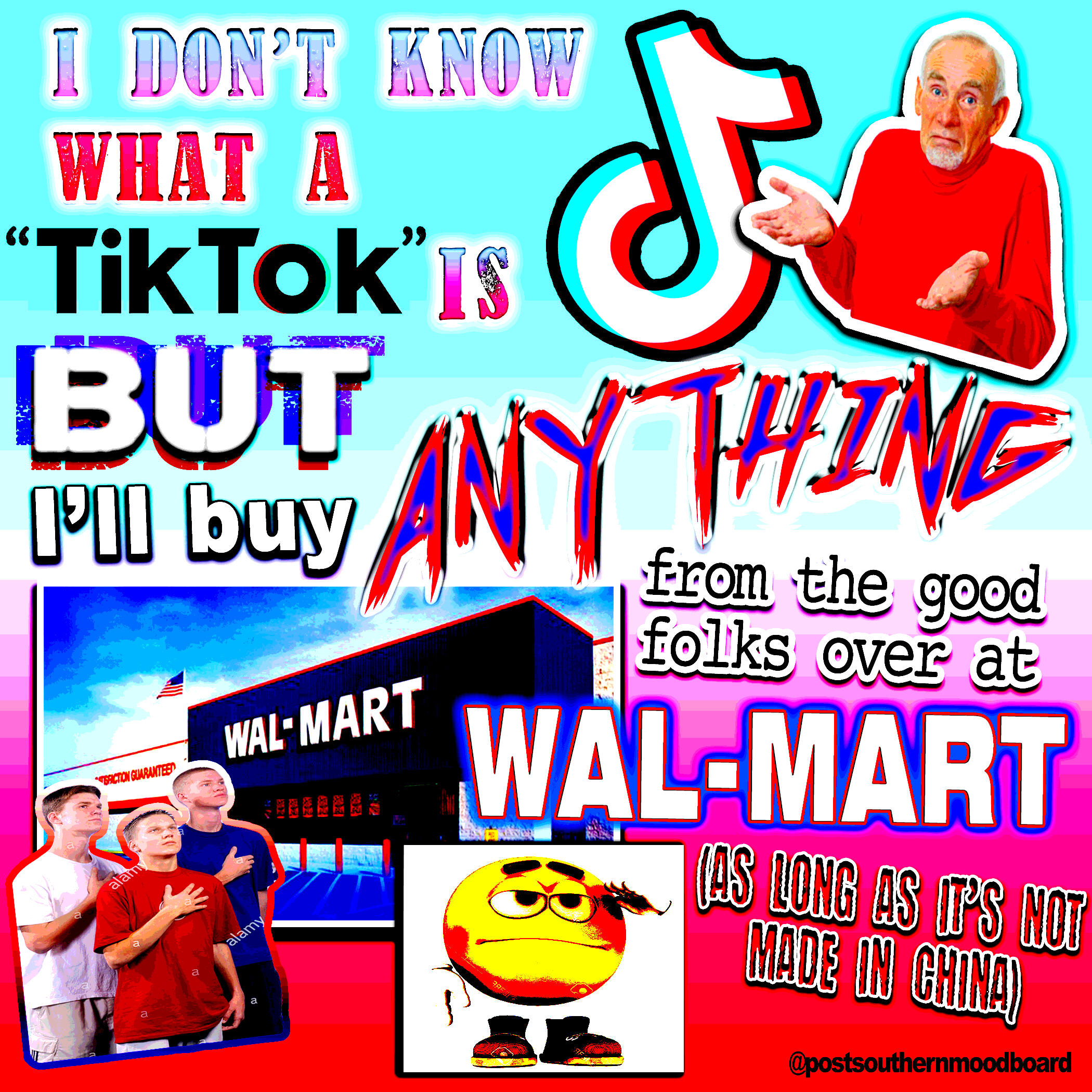 From 2020 to 2023, I ran an Instagram meme page called @postsouthernmoodboard. The page served as a platform for my interests in digital art and graphic design, shitposting, and for a meta-analysis of my own personal relationship to my Southern upbringing as I became an outside observer to my previous culture after moving to New York from 2017-2022. The full project included a gallery of Instagram highlights which showcased various aesthetics which I associated ironically to the Southern and Western culture and memetics which I was satirizing.The complete works of this project are still available on Instagram. Below is a selection of my favorite grid posts.