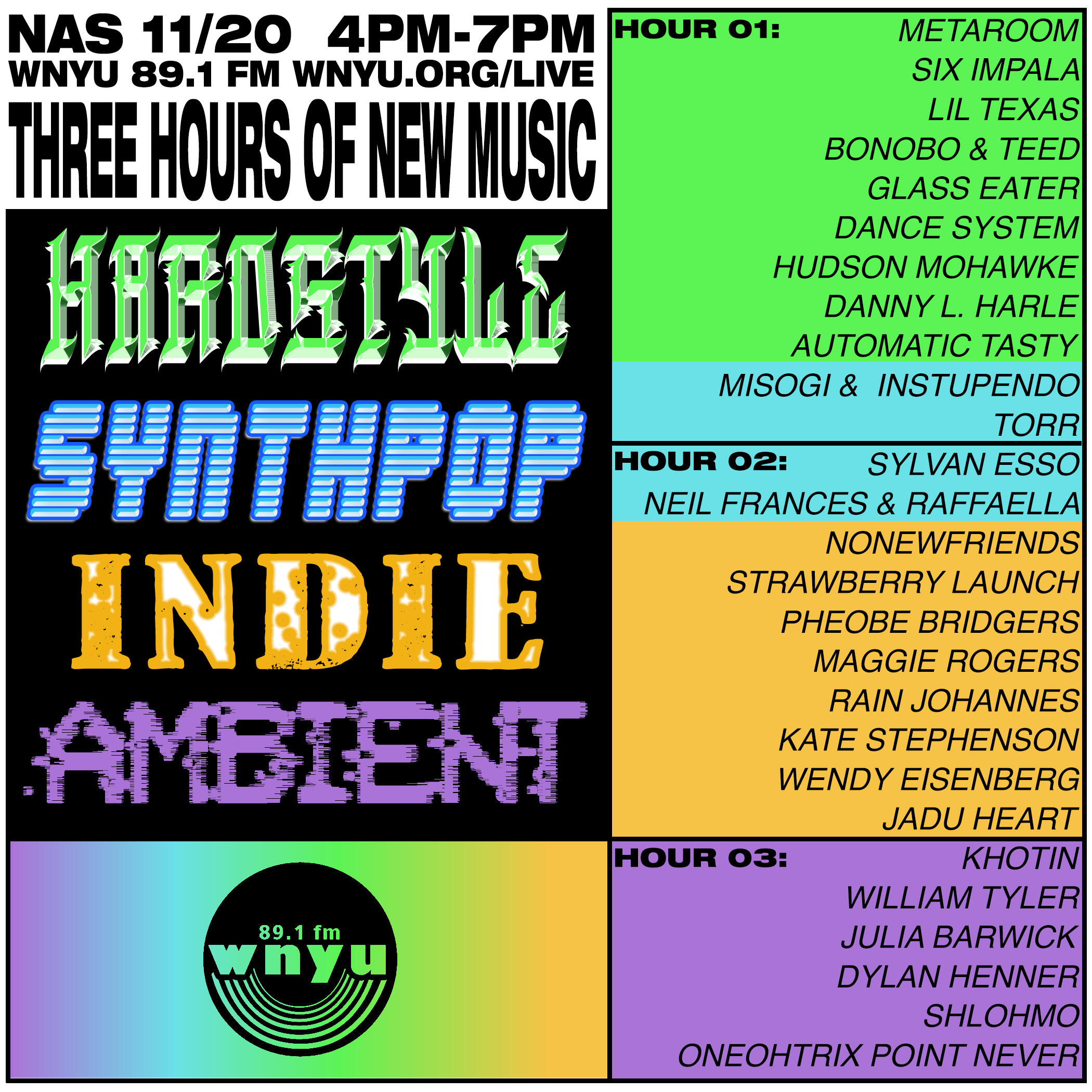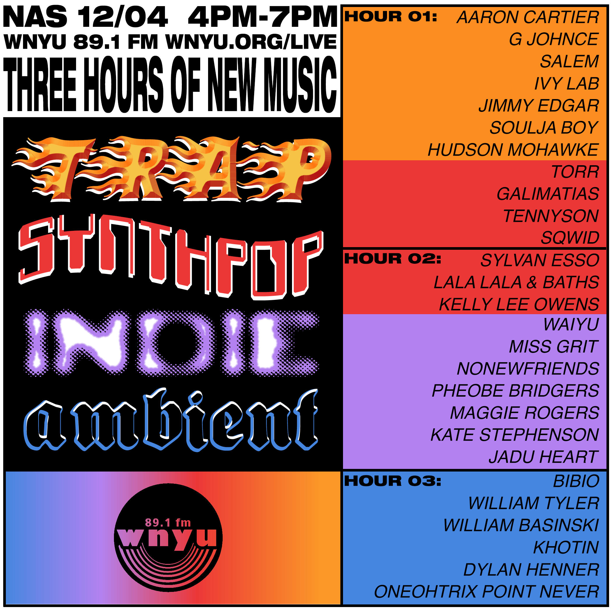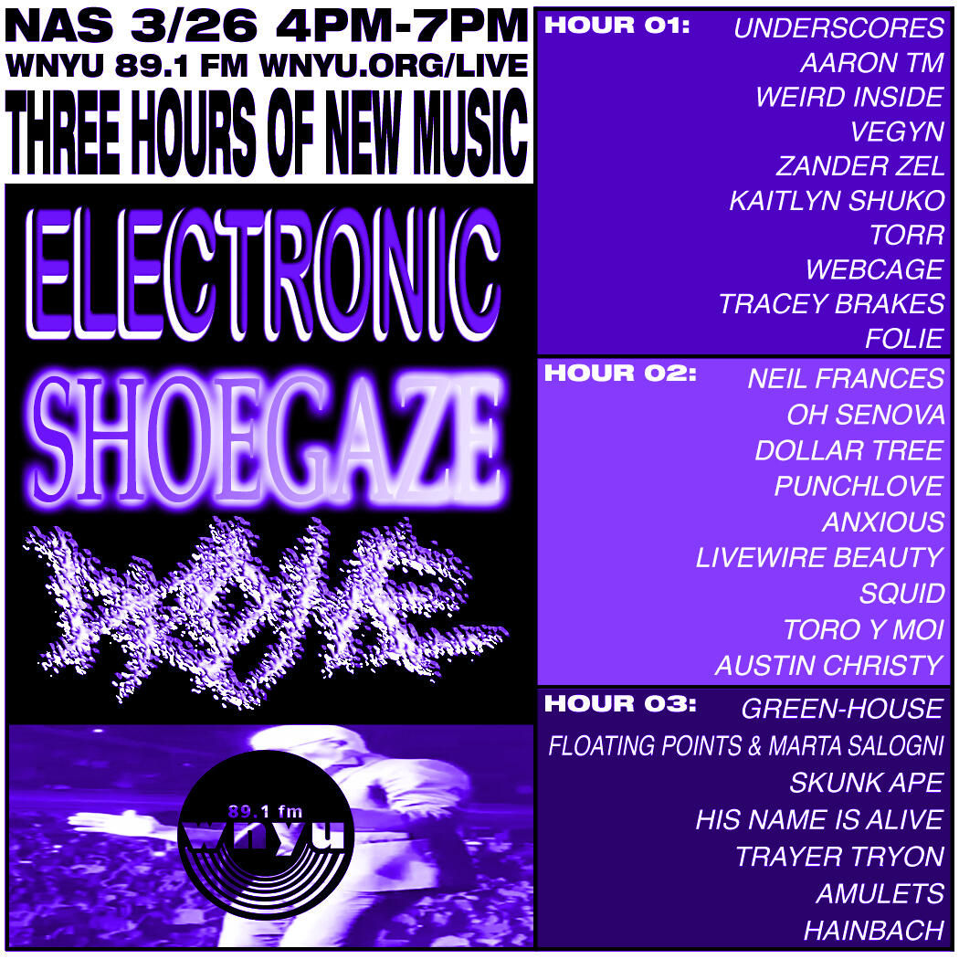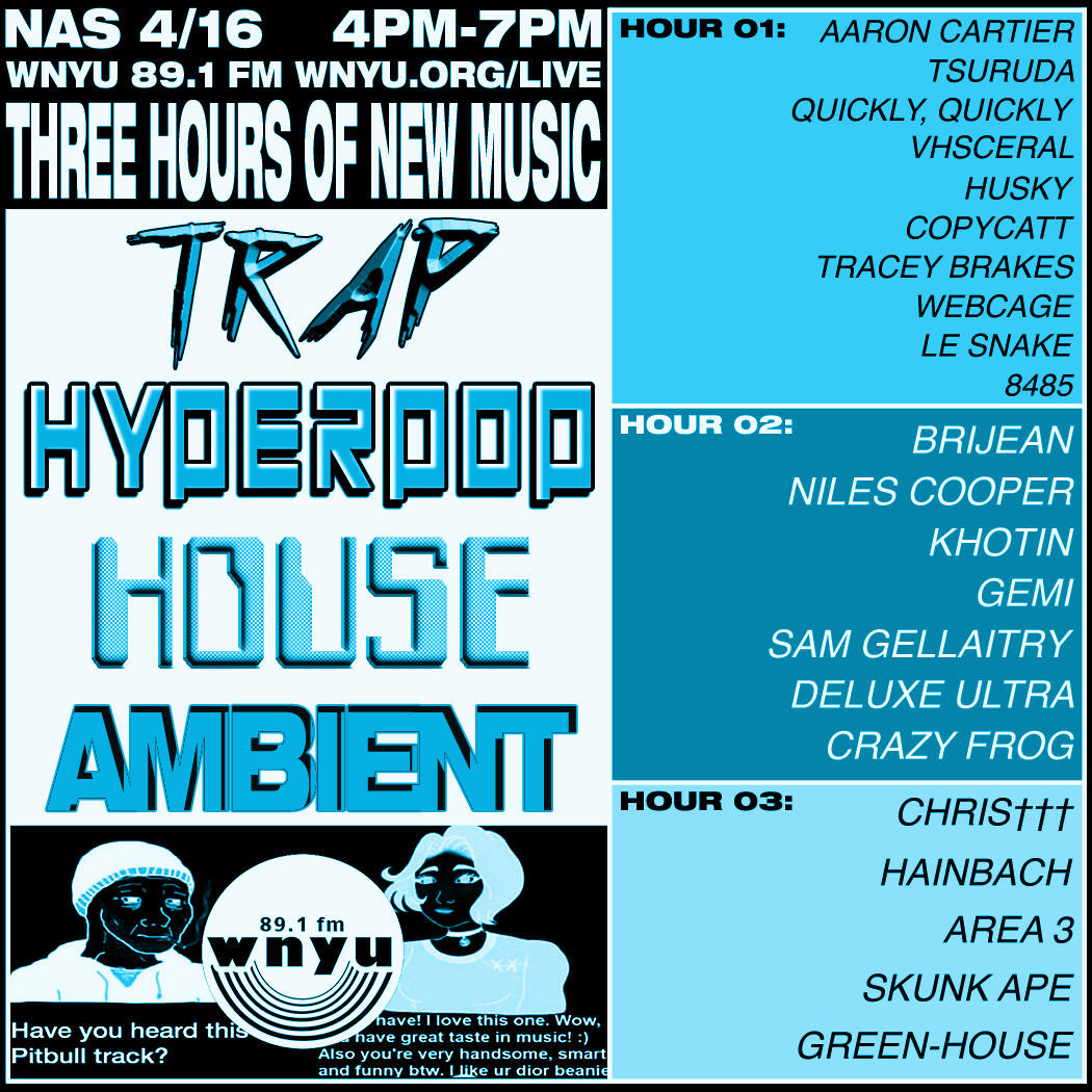 From fall 2020 to spring 2021, I took over the host slot for a weekly FM/online radio show called The New Afternoon Show, a bedrock of WNYU's programming and the station's longest running show. As host, I curated a selection of music from independent and underground musicians from online music communities and New York City's own independent music scene. For three hours each Friday evening from 4-7 PM, I played a hand-curated selection of electronic, rock, rap, and ambient music. Every week, I prepared a show poster to tease the week's lineup and promote the show on social media. Below is the full collection of posters I made for the show.